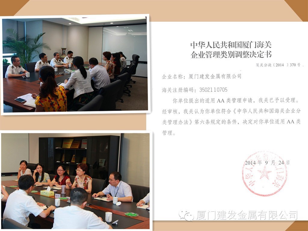 “AA類管理企業(yè)”是海關(guān)企業(yè)管理類別中的最高級別(即最高信用等級),享有最快的通關(guān)速度和最低的通關(guān)成本等優(yōu)勢。建發(fā)金屬此次成功申請“AA類管理企業(yè)”,表明了海關(guān)對建發(fā)金屬長期以來誠實申報、合法經(jīng)營、規(guī)范管理的充分肯定。公司將在享受原有“A類管理企業(yè)”11項邊界服務(wù)措施的基礎(chǔ)上,再獲得“先放后稅”、“適用較低查驗率”、“加工貿(mào)易免設(shè)臺賬”、“海關(guān)專人協(xié)調(diào)解決疑難”等諸多便利措施。